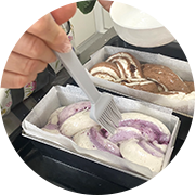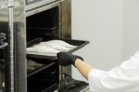 アレルゲン8品目を工房内に持ち込まないため、コンタミネーションの心配がありません。焼き立てをそのままお届けできるように、急速冷凍ブラストチラー/ショックフリーザーを導入。菌が繁殖しやすい温度帯を短時間で素早く通過するため、安全に商品を冷却。急速冷却を行うことで、焼き立ての香りや風味を封じ込め、水分をしっかりとキープ!短時間で冷却するので自然解凍でもふわふわ美味しくお召し上がりいただけます。
